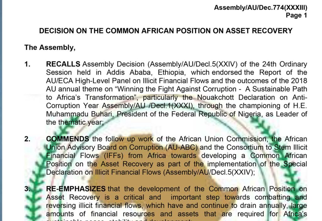 Resources Reports Technical Papers CoDA Dialogues Outcome Documents African Union Strategic Documents Speeches Facebook Twitter Youtube Reports Five years of Common African Position on Asset Recovery (CAPAR) Successes and Challenges of Implementing the Recommendations of African Union High Level Panel on Illicit Financial Flows Annual Trade Development Effectiveness Report 2019 Report of the High Level Panel on Illicit Financial Flows from Africa Stemming Illicit Financial Flows from Africa: The Journey so Far Technical Papers Vaccine R&D and Manufacturing in Africa Advocacy for Vaccine Research, Development and Manufacturing in Africa Common Africa Position on Asset Recovery (CAPAR) Examining the Implications of the Global Minimum Corporate Tax for Africa Fiscal Policy and Domestic Revenue Mobilization in Africa in the Face of the COVID-19 Pandemic A Tough Call? Comparing Tax Revenues to Be Raised by Developing Countries from the Amount A and the UN Model Treaty Article 12B Regimes Financing Post-COVID Relief, Recovery and Reform in Africa CoDA Dialogues Outcome Documents Consultative Meeting on the Establishment of the African Business Council (ABC) Vaccine R&D and Manufacturing in Africa Policy Dialogue of African Business Associations on Implementing the African Continental Free Trade Area (AfCFTA) Stakeholder Dialogue on Continental Trade and Strengthening Implementation of the African Continental Free Trade Area (AfCFTA) Outcome report of workshop to validate technical papers on vaccines and vaccinations Outcomes and Recommendations of the First African Fiscal Policy Forum Report and Main Recommendations of the CoDA High-Level Dialogue Held on 28 & 29 March, 2022 at the OOPL, Abeokuta CoDA-South Centre Dialogue Series on Illicit Financial Flows (IFFs)(EN) (FR) African Union Strategic Documents Assembly Decisions on the CFTA Africa Integration Day AU Assembly 19 XXXII Addis Ababa Action Agenda of the Third International Conference on Financing for Development Decision on the Common African Position on Asset Recovery African Continental Free Trade Area Questions & Answers Agenda 2063: The Africa We Want Declaration on the African Anti-Corruption Year African Youth Charter Speeches Speech by Gov. Godwin Obaseki Speech by the Nigeria Minister of Health Speech by H.E. Olusegun Obasanjo